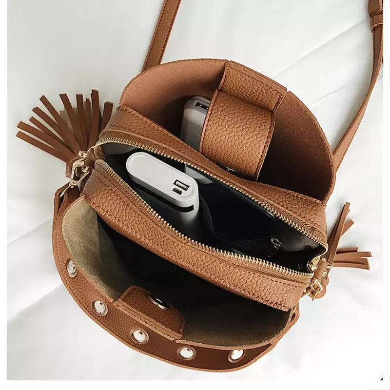 Scrub Vintage Tassel Bucket Bag Brown